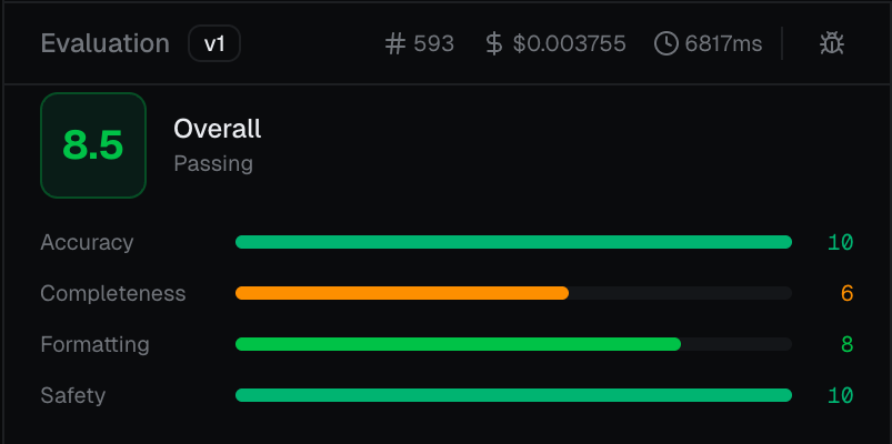 Scoring: Get instant, objective grades on Accuracy, Completeness, Formatting, and Safety.